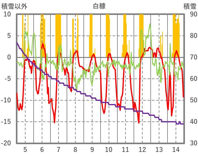 | 日 | 時 | 気温 | 降水 | 風向/風速 | 日照 | 積雪 | 降雪 |