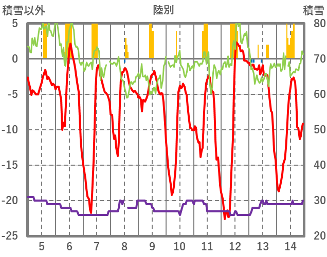 | 日 | 時 | 気温 | 降水 | 風向/風速 | 日照 | 積雪 | 降雪 |