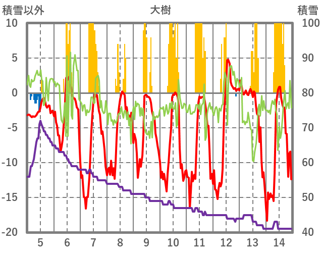 | 日 | 時 | 気温 | 降水 | 風向/風速 | 日照 | 積雪 | 降雪 |