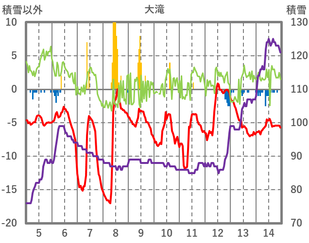 | 日 | 時 | 気温 | 降水 | 風向/風速 | 日照 | 積雪 | 降雪 |
