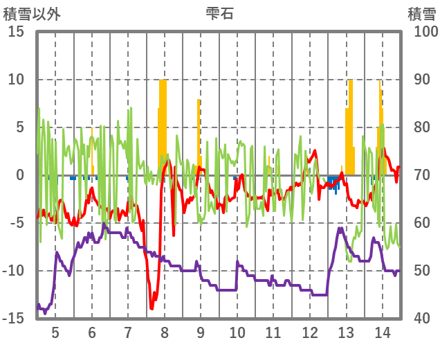 | 日 | 時 | 気温 | 降水 | 風向/風速 | 日照 | 積雪 | 降雪 |