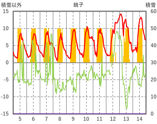 | 日 | 時 | 気温 | 降水 | 風向/風速 | 日照 | 積雪 | 降雪 |