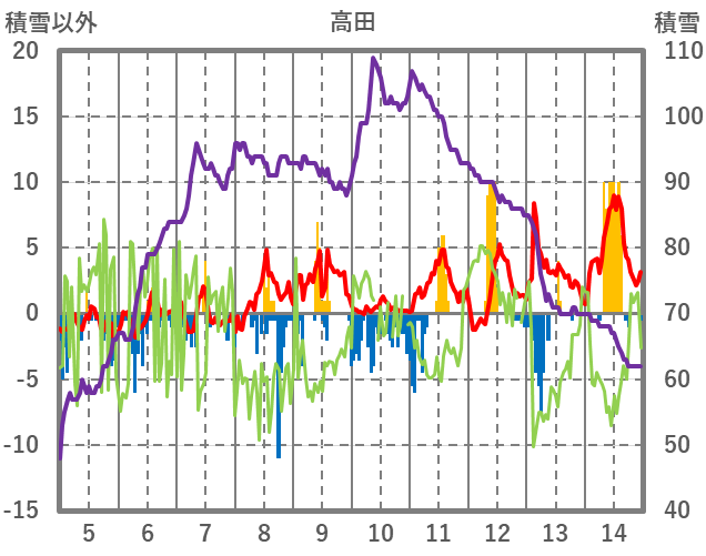 | 日 | 時 | 気温 | 降水 | 風向/風速 | 日照 | 積雪 | 降雪 |