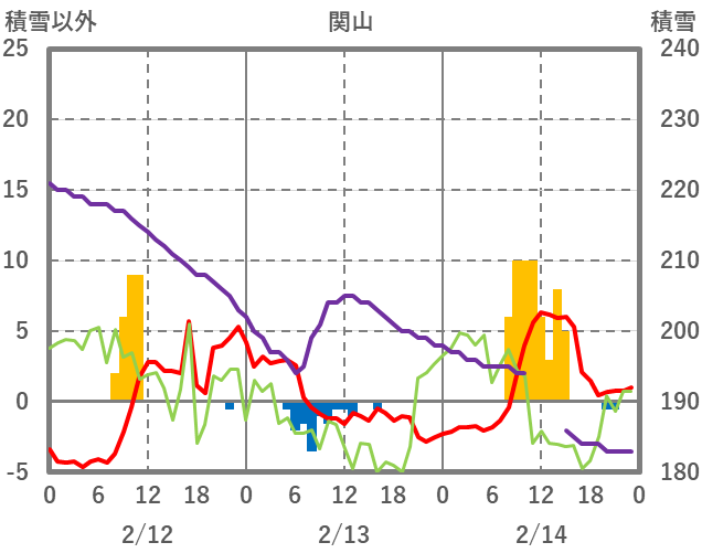 | 日 | 時 | 気温 | 降水 | 風向/風速 | 日照 | 積雪 | 降雪 |