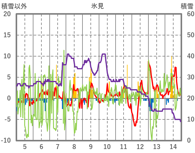 | 日 | 時 | 気温 | 降水 | 風向/風速 | 日照 | 積雪 | 降雪 |