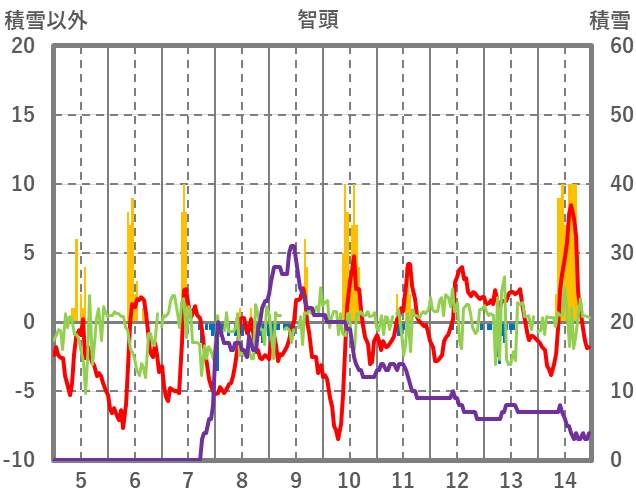 | 日 | 時 | 気温 | 降水 | 風向/風速 | 日照 | 積雪 | 降雪 |