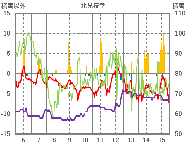 | 日 | 時 | 気温 | 降水 | 風向/風速 | 日照 | 積雪 | 降雪 |