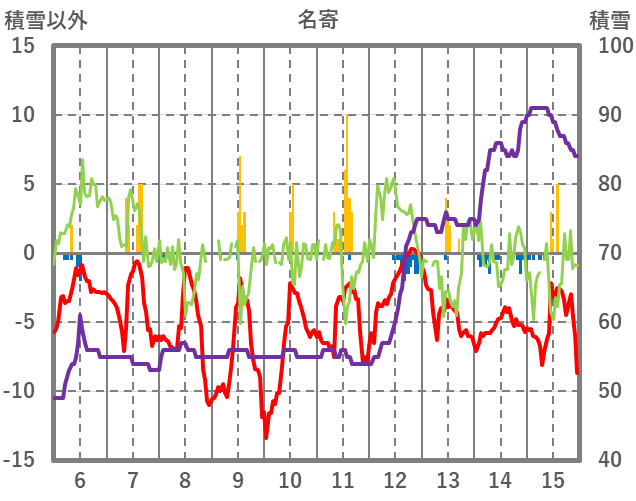 | 日 | 時 | 気温 | 降水 | 風向/風速 | 日照 | 積雪 | 降雪 |