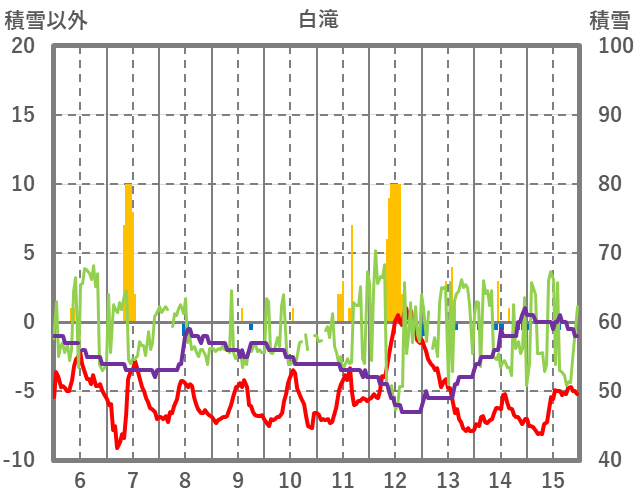 | 日 | 時 | 気温 | 降水 | 風向/風速 | 日照 | 積雪 | 降雪 |