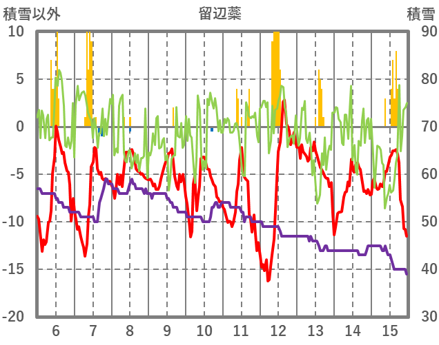 | 日 | 時 | 気温 | 降水 | 風向/風速 | 日照 | 積雪 | 降雪 |