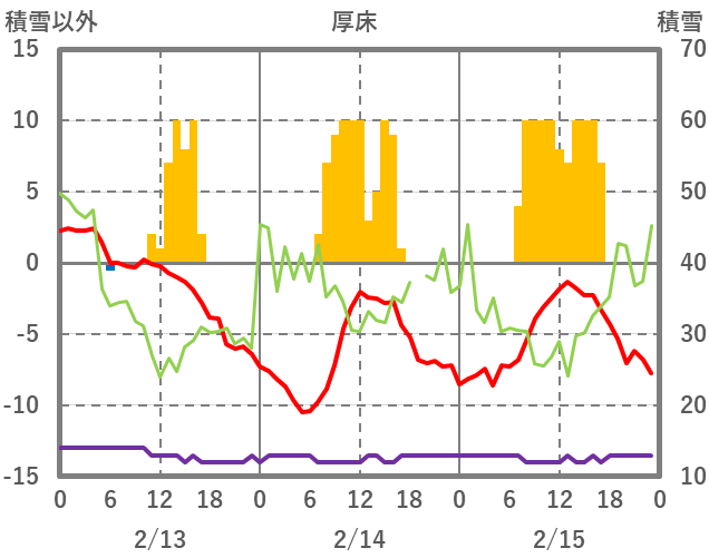 | 日 | 時 | 気温 | 降水 | 風向/風速 | 日照 | 積雪 | 降雪 |