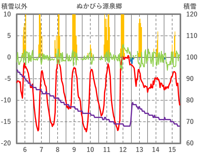 | 日 | 時 | 気温 | 降水 | 風向/風速 | 日照 | 積雪 | 降雪 |
