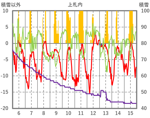 | 日 | 時 | 気温 | 降水 | 風向/風速 | 日照 | 積雪 | 降雪 |