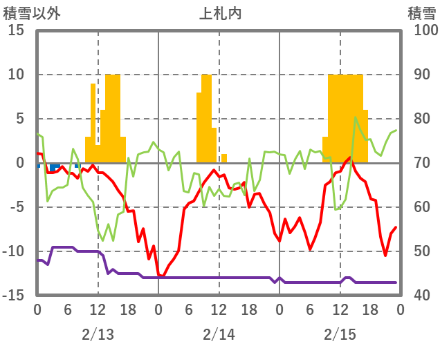 | 日 | 時 | 気温 | 降水 | 風向/風速 | 日照 | 積雪 | 降雪 |