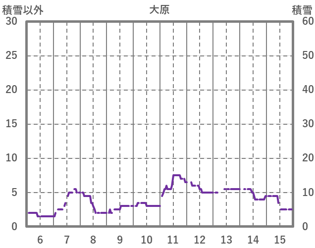 | 日 | 時 | 気温 | 降水 | 風向/風速 | 日照 | 積雪 | 降雪 |