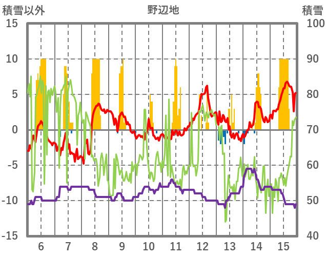 | 日 | 時 | 気温 | 降水 | 風向/風速 | 日照 | 積雪 | 降雪 |