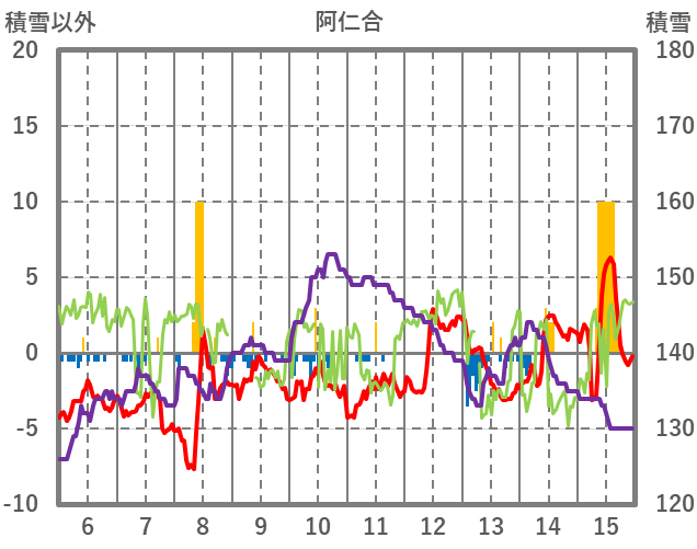 | 日 | 時 | 気温 | 降水 | 風向/風速 | 日照 | 積雪 | 降雪 |