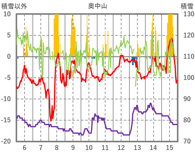 | 日 | 時 | 気温 | 降水 | 風向/風速 | 日照 | 積雪 | 降雪 |