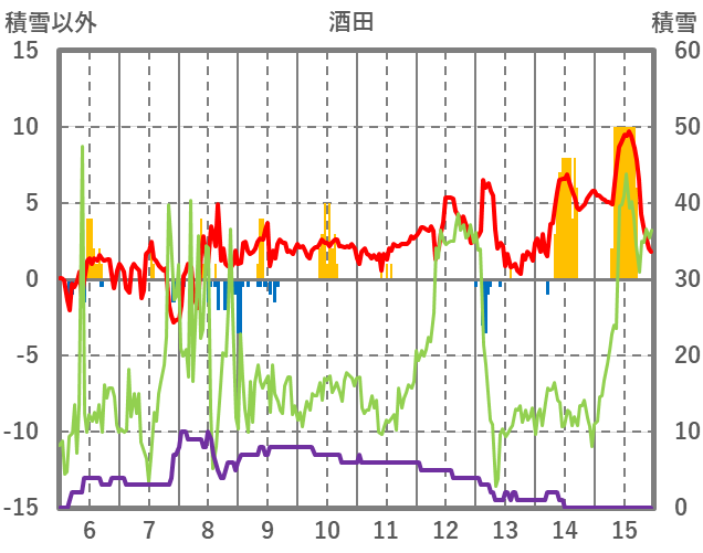 | 日 | 時 | 気温 | 降水 | 風向/風速 | 日照 | 積雪 | 降雪 |