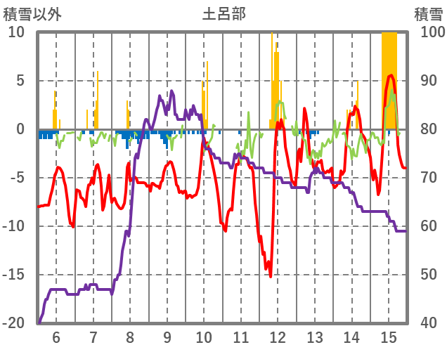 | 日 | 時 | 気温 | 降水 | 風向/風速 | 日照 | 積雪 | 降雪 |