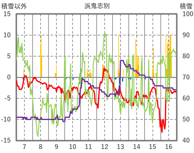 | 日 | 時 | 気温 | 降水 | 風向/風速 | 日照 | 積雪 | 降雪 |