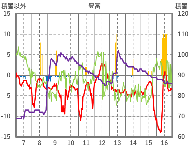 | 日 | 時 | 気温 | 降水 | 風向/風速 | 日照 | 積雪 | 降雪 |