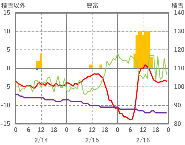 | 日 | 時 | 気温 | 降水 | 風向/風速 | 日照 | 積雪 | 降雪 |