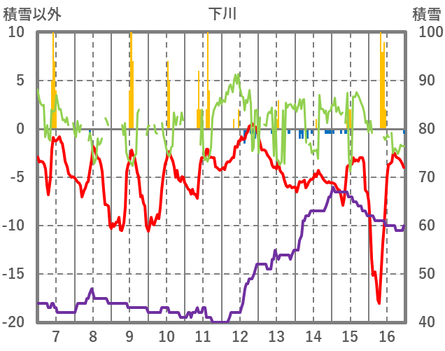 | 日 | 時 | 気温 | 降水 | 風向/風速 | 日照 | 積雪 | 降雪 |