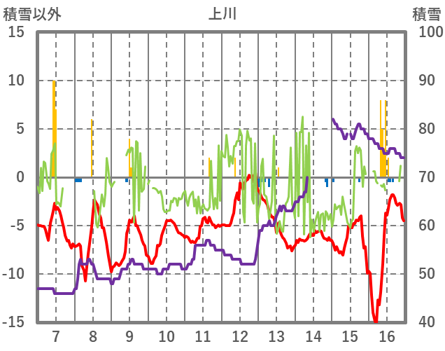 | 日 | 時 | 気温 | 降水 | 風向/風速 | 日照 | 積雪 | 降雪 |