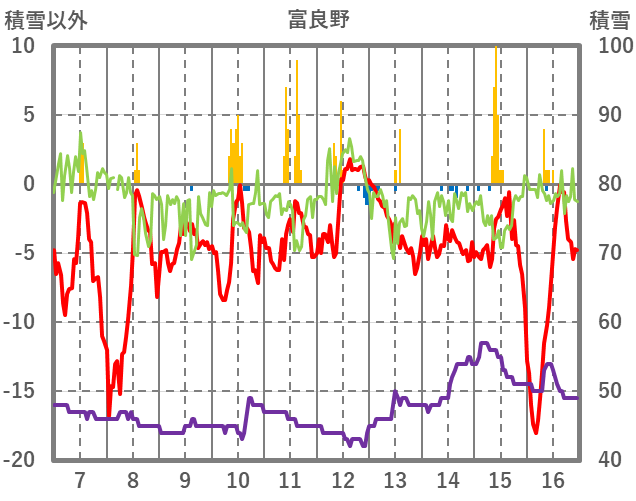 | 日 | 時 | 気温 | 降水 | 風向/風速 | 日照 | 積雪 | 降雪 |