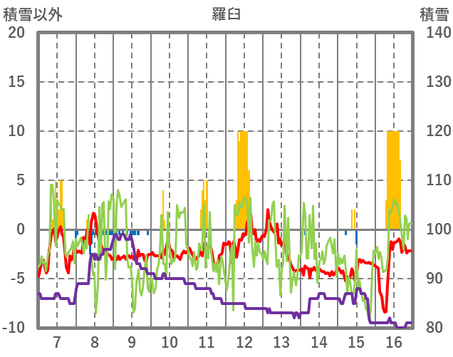 | 日 | 時 | 気温 | 降水 | 風向/風速 | 日照 | 積雪 | 降雪 |