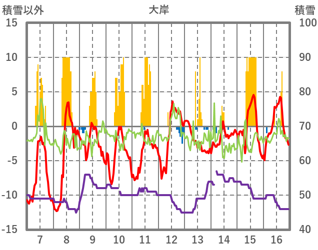 | 日 | 時 | 気温 | 降水 | 風向/風速 | 日照 | 積雪 | 降雪 |