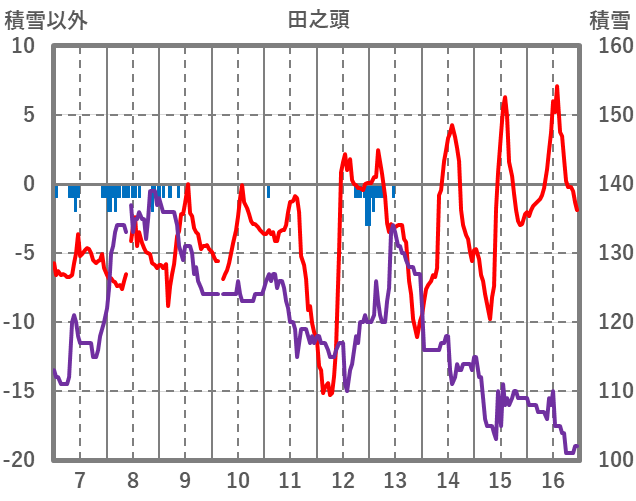 | 日 | 時 | 気温 | 降水 | 風向/風速 | 日照 | 積雪 | 降雪 |