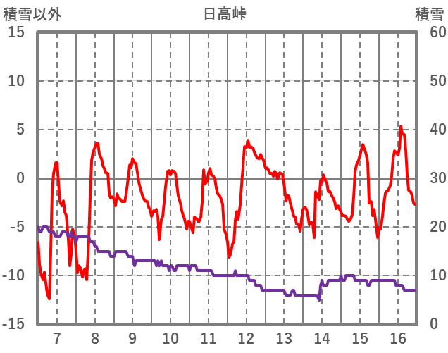 | 日 | 時 | 気温 | 降水 | 風向/風速 | 日照 | 積雪 | 降雪 |