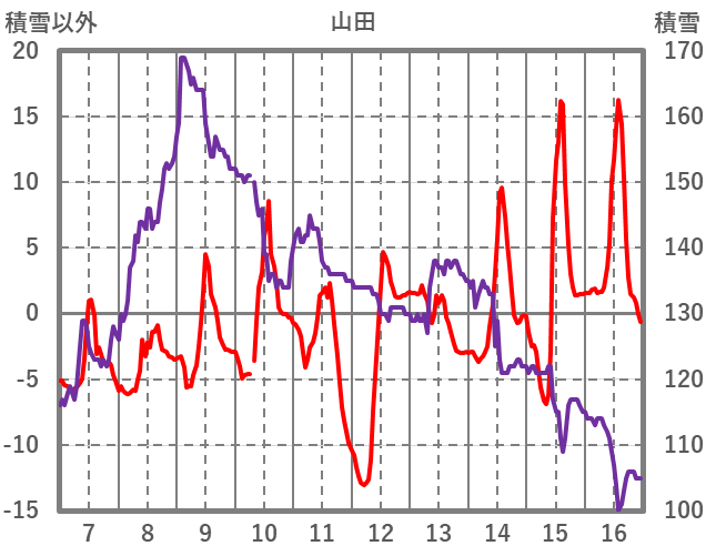 | 日 | 時 | 気温 | 降水 | 風向/風速 | 日照 | 積雪 | 降雪 |