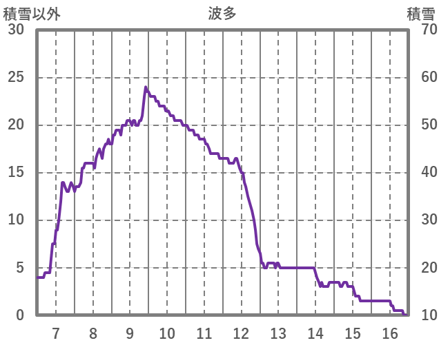 | 日 | 時 | 気温 | 降水 | 風向/風速 | 日照 | 積雪 | 降雪 |