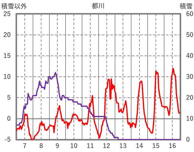 | 日 | 時 | 気温 | 降水 | 風向/風速 | 日照 | 積雪 | 降雪 |