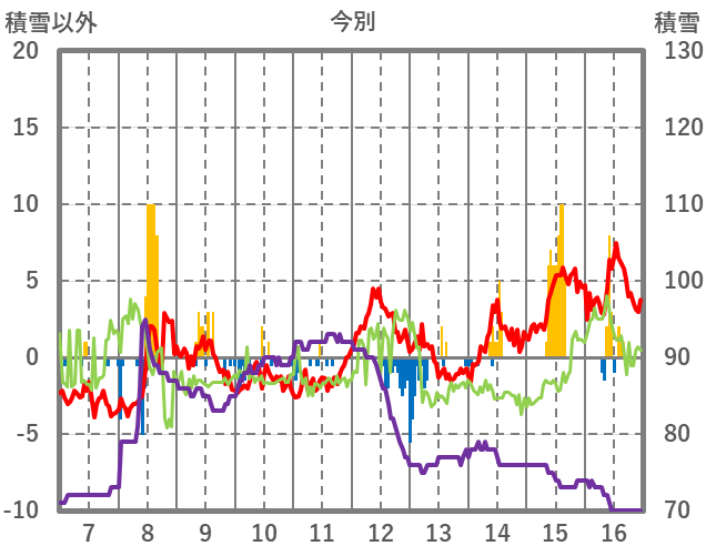 | 日 | 時 | 気温 | 降水 | 風向/風速 | 日照 | 積雪 | 降雪 |