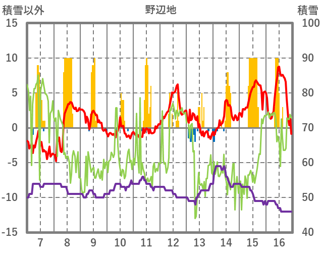 | 日 | 時 | 気温 | 降水 | 風向/風速 | 日照 | 積雪 | 降雪 |