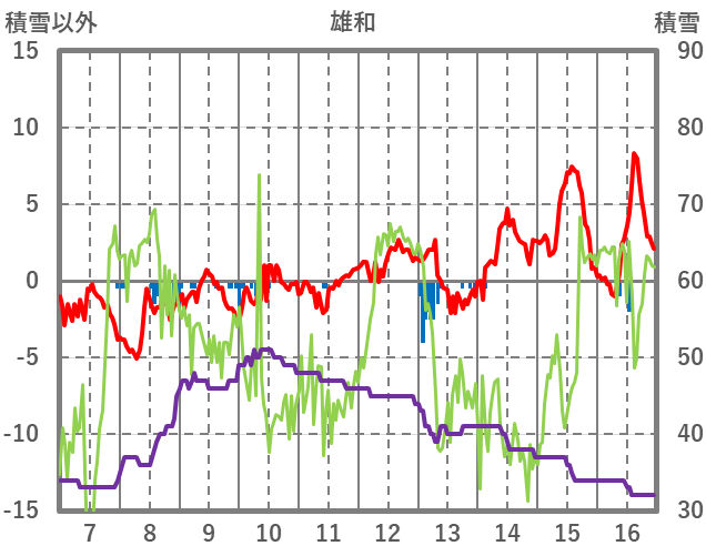 | 日 | 時 | 気温 | 降水 | 風向/風速 | 日照 | 積雪 | 降雪 |