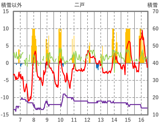 | 日 | 時 | 気温 | 降水 | 風向/風速 | 日照 | 積雪 | 降雪 |