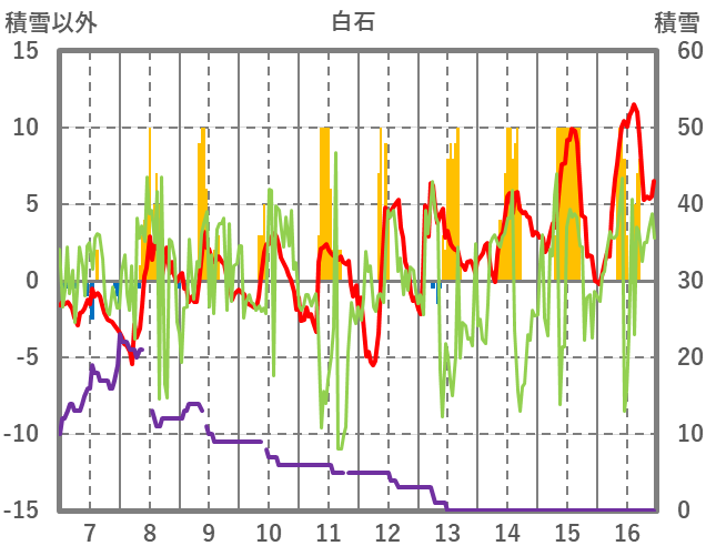 | 日 | 時 | 気温 | 降水 | 風向/風速 | 日照 | 積雪 | 降雪 |
