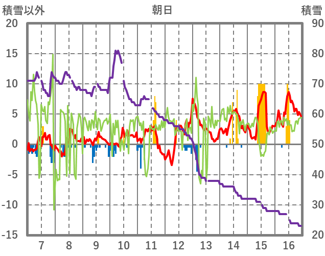 | 日 | 時 | 気温 | 降水 | 風向/風速 | 日照 | 積雪 | 降雪 |