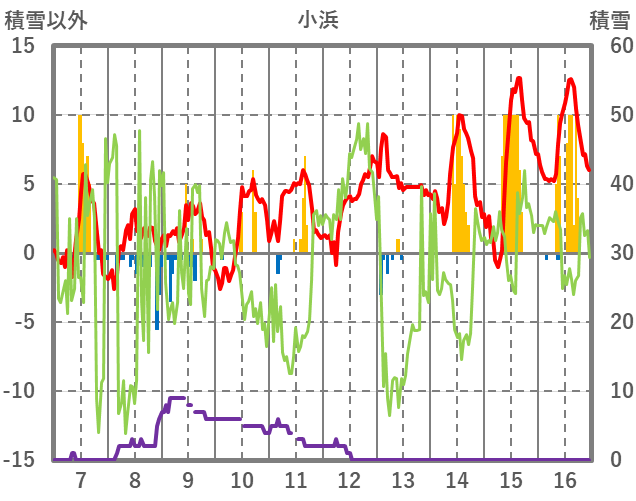 | 日 | 時 | 気温 | 降水 | 風向/風速 | 日照 | 積雪 | 降雪 |