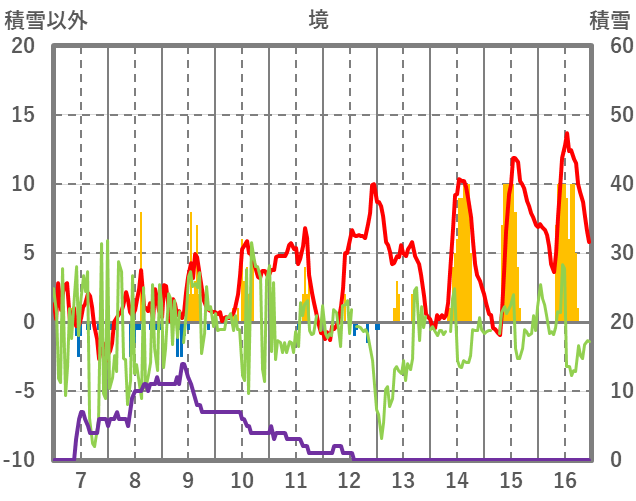 | 日 | 時 | 気温 | 降水 | 風向/風速 | 日照 | 積雪 | 降雪 |