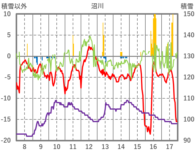 | 日 | 時 | 気温 | 降水 | 風向/風速 | 日照 | 積雪 | 降雪 |