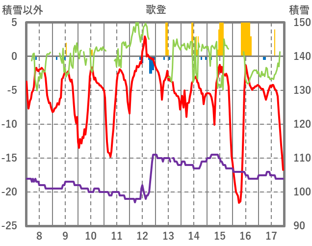 | 日 | 時 | 気温 | 降水 | 風向/風速 | 日照 | 積雪 | 降雪 |