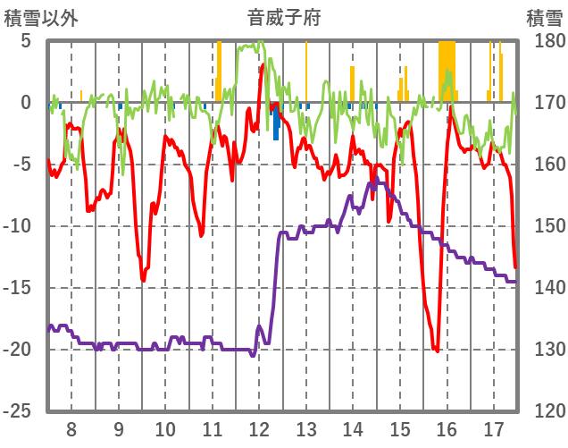| 日 | 時 | 気温 | 降水 | 風向/風速 | 日照 | 積雪 | 降雪 |