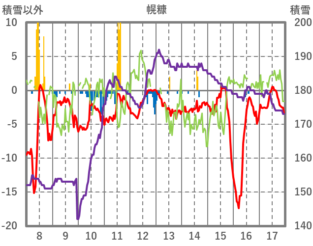 | 日 | 時 | 気温 | 降水 | 風向/風速 | 日照 | 積雪 | 降雪 |