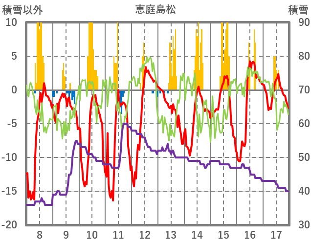 | 日 | 時 | 気温 | 降水 | 風向/風速 | 日照 | 積雪 | 降雪 |